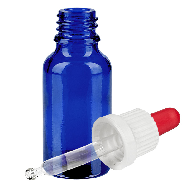 - Apteekkipullo 18 mm:n kierteellä (UT18). Täydellinen, tarkasti istuvalla tarkkuuslasipipetillä tippatarkkaa annostelua varten.