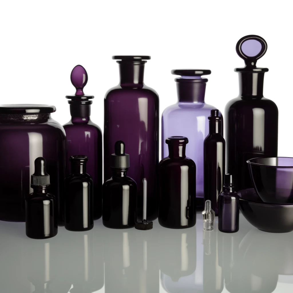 Täältä löydät öljypullot, apteekkipullot, tiputuspullot, astiat ja kulhot violettilasista.