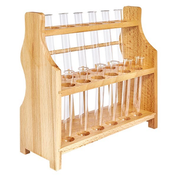 Puinen koeputkiteline, jossa on 12 borosilikaattikoeputkea 100x12