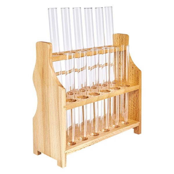 - Kuvaus: Puusta valmistettu koeputkiteline, jossa on 12 koeputkea sekä soodakalkki 160x16.